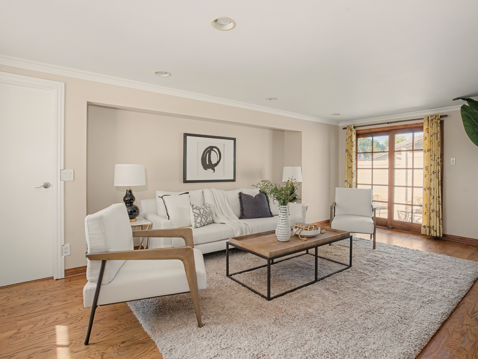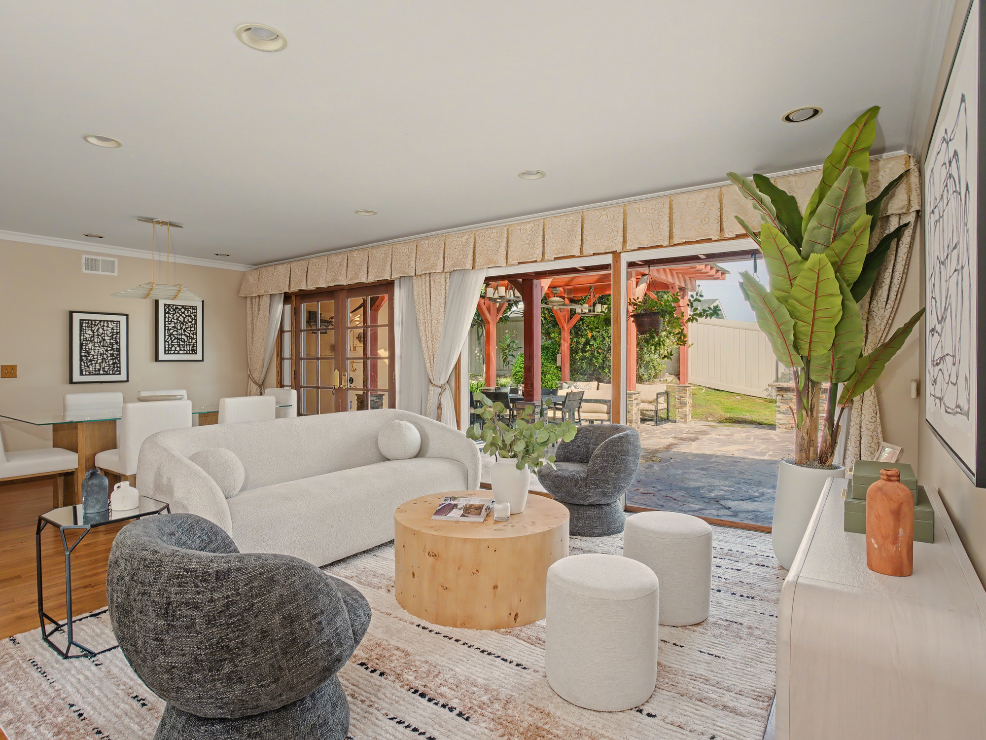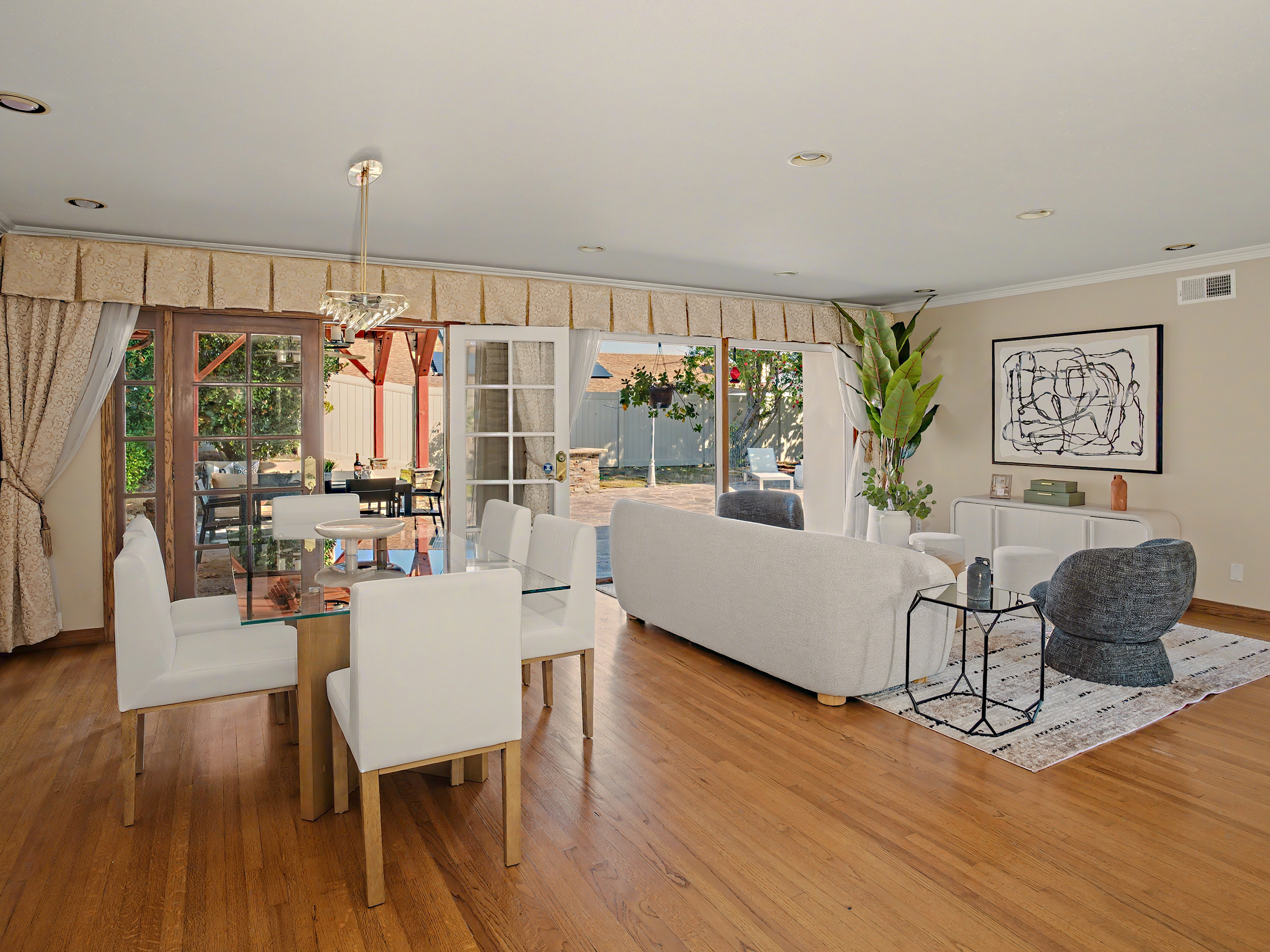 Beautifully updated turn-key spacious single level home with 4 bedrooms, 3 baths, and Living/Dining and Family areas. The home has hardwood floors, crown molding, granite counters and double pane windows/doors throughout for a sunlit, natural ambience. It’s efficient layout is designed to enjoy flowing indoor/outdoor living. Enter into the Living/Dining room that opens to French doors to a custom-built backyard entertaining area with a huge slate patio, barbecue station to put your own appliance, and large covered pergola with lights, fan, and new privacy vinyl fence. A full glass wall in the Living Room/Dining area overlooks the patio and completes the indoor/outdoor feeling. Sunny Kitchen with granite counters, breakfast bar, breakfast nook area, wood cabinetry, built-in fridge and new flooring. Family Room off the kitchen opens to a sunny and private brick patio. Large Primary Suite with an entire wall of built-in closets/cabinets and primary bath with walk-in shower. Of the 3 additional bedrooms, 2 are primary-size bedrooms. The large rear-bedroom opens onto the slate patio through a new 8-feet double-paned sliding door. The whimsical fourth bedroom is perfect for a child's room or a home-office, and opens to the private brick patio. All 3 bathrooms are updated, with granite counters, and one with a double sink. The two-car finished garage off the Family Room with built-in cabinetry could be flex room for exercise, office, game room, etc.  Laundry area is located here. This home has great curb-appeal with new paint in and out, a new roof, newly refinished wood floors, granite resealed & polished, new dishwasher, and newly landscaped front yard. Award winning Palos Verdes schools. Centrally located within walking distance to Silver Spur Elementary School, Palos Verdes Peninsula High School and Peninsula Shopping Center. Harbor and city lights view from Driveway and Garage.